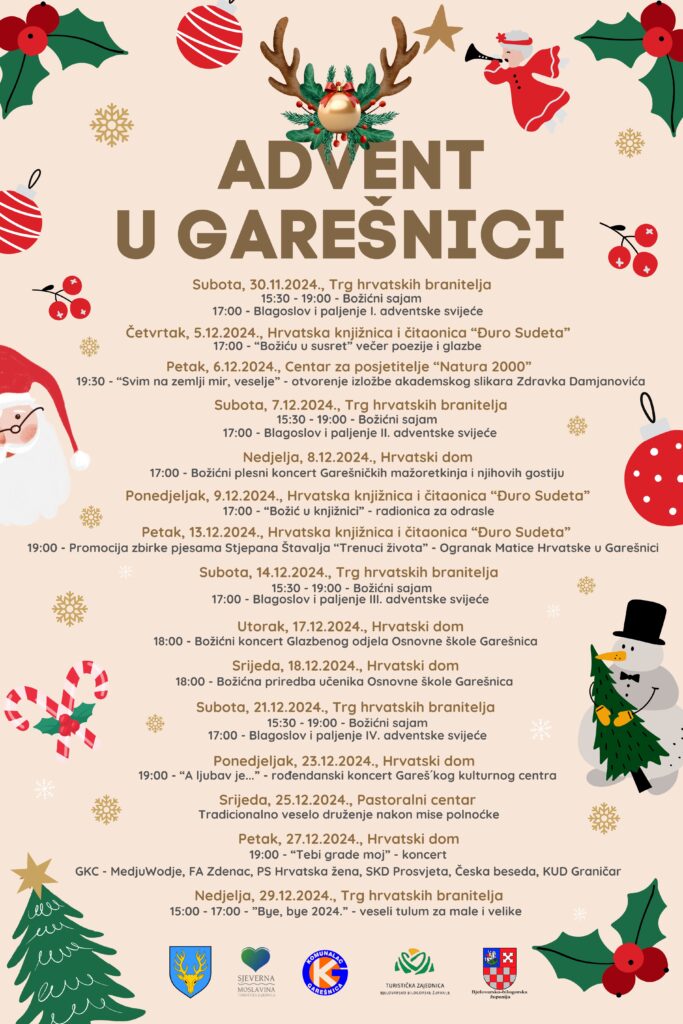 U tijeku su pripreme za ovogodišnju manifestaciju „Advent u Garešnici“ koja će ove godine, kako doznajemo, biti najsadržajnija do sada, prepuna raznih kulturnih i zabavnih događanja. Riječ je o tradicionalnoj manifestaciji koju zajednički organiziraju Turistička zajednica Sjeverna Moslavina i Grad Garešnica uz potporu gradskog Komunalca i brojnih gradskih udruga. Kako nam je rekla direktorica TZ Daniela Belak uskoro će krenuti radovi na uređenju gradskog središta za nadolazeće blagdane kako bi Garešnica blagdan Isusova rođenja dočekala u svečanom izdanju. Oko fontane na Trgu hrvatskih branitelja, kao i svake godine, bit će postavljen adventski vijenac, a božićne dekoracije krasit će, osim trga, i brojne druge lokacije u gradu.