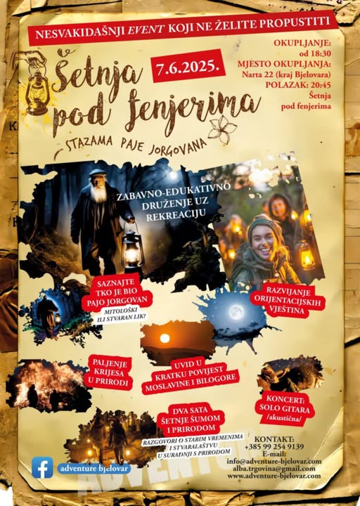 Adventure Bjelovar, poznata bjelovarska tvrtka koja godinama organizira događanja u prirodi, za ovu subotu priprema posebno iskustvo – večernju šetnju pod fenjerima, glazbeni program i druženje u Narti. Riječ je o nastavku proljetnog ciklusa rekreativnih aktivnosti kojima se potiče boravak u prirodi, zajedništvo i aktivni turizam.