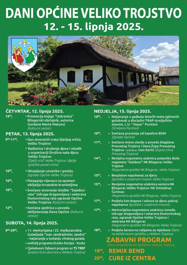 Općina Veliko Trojstvo i ove godine organizira višednevnu proslavu Dana Općine, koja će se održati od 12. do 15. lipnja 2025. Program obuhvaća bogat niz kulturnih, sportskih i zabavnih sadržaja namijenjenih svim dobnim skupinama, s naglaskom na njegovanje tradicije, zajedništva i lokalnog identiteta.