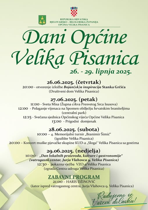 Općina Velika Pisanica i ove godine organizira bogat program povodom Dana općine, koji će se održati od 26. do 29. lipnja 2025. godine. Tijekom četiri dana posjetitelje očekuju kulturni, zabavni, vjerski i sportski sadržaji, uz poseban naglasak na očuvanje lokalne tradicije i zajedništva.