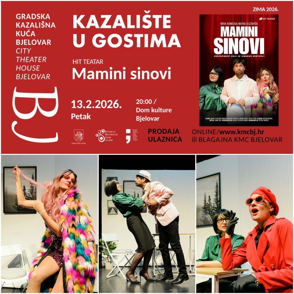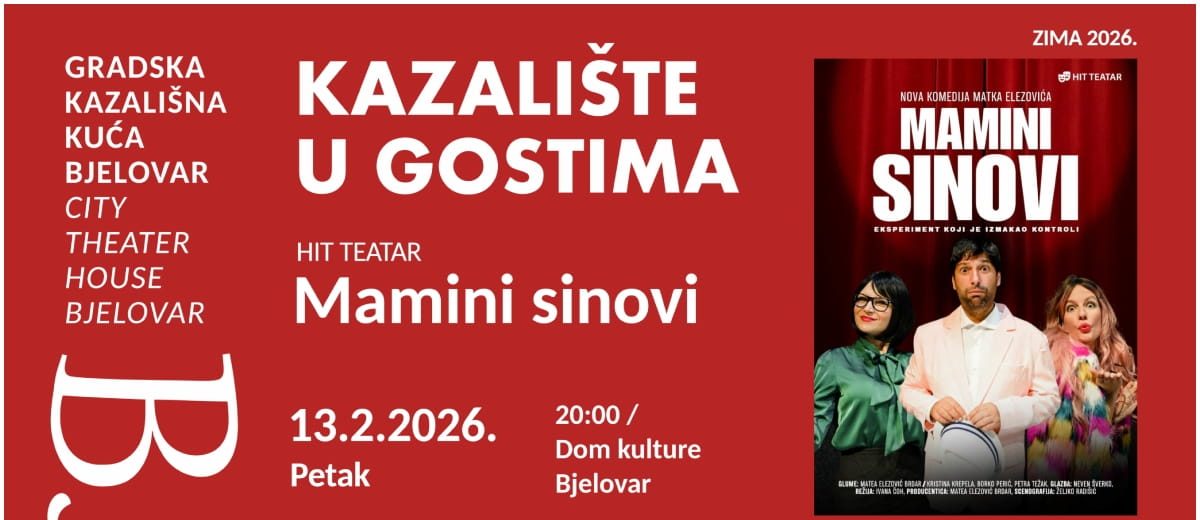 Kulturni i multimedijski centar Bjelovar i Gradska kazališna kuća Bjelovar objavili su kako sljedećeg petka, 13. veljače, nastavlja program Kazalište u gostima. Predstava “Mamini sinovi” Hit Teatra odigrat će se u bjelovarskom Domu kulture s početkom u 20 sati.