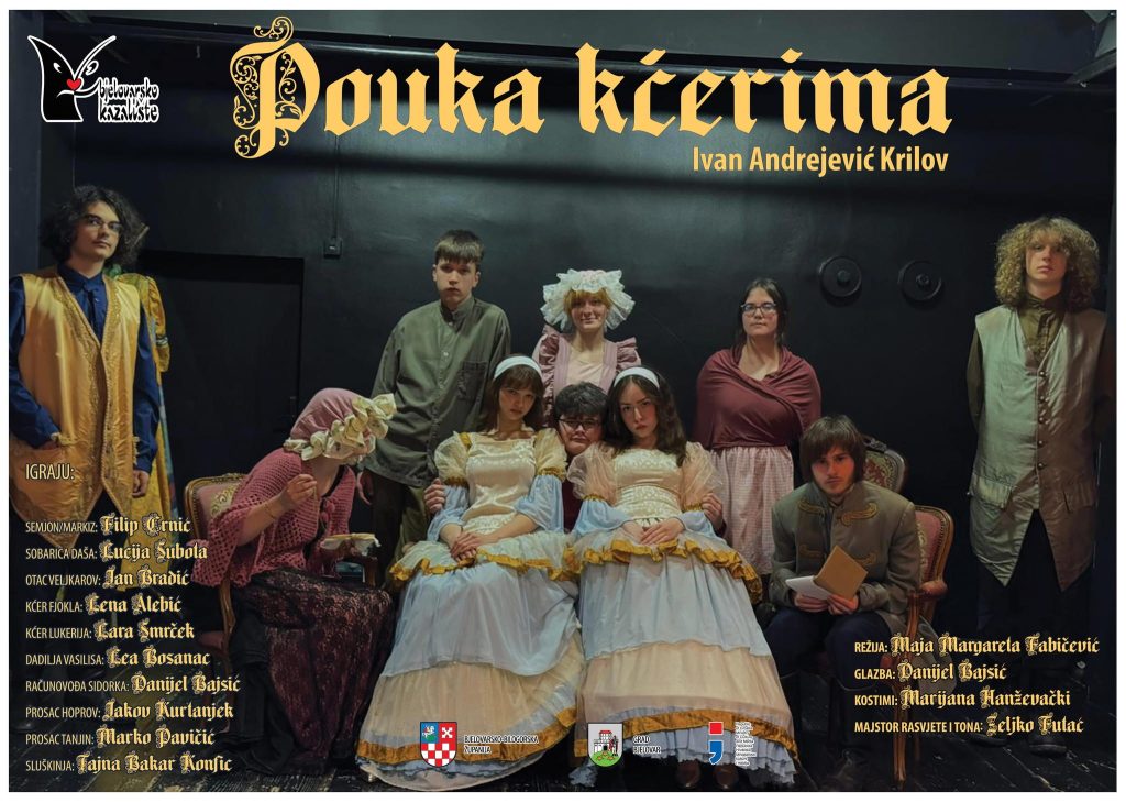 Predstavu Pouka kćerima odigrat će dramska skupina Bjelokaz 2 u režiji Margarete Fabičević. Marijana Hanževački priredila je kostime, originalnu glazbu osmislio je Danijel Bajsić. Dramaturšku pomoć pružila je Tajna Bakar Konfic, a majstor tona i rasvjete je Željko Futač.