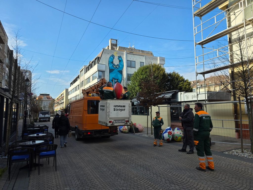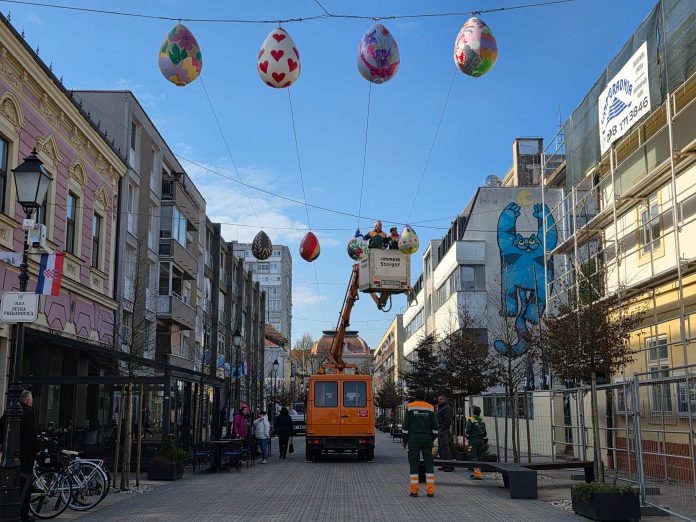 Na bjelovarskom korzu u petak, 20. ožujka započelo je ukrašavanje u povodu nadolazećeg blagdana, Uskrsa. Vrijedne djelatnike Komunalca zatekli smo u postavljanju velikih pisanica duž korza dizalicom, a ovi viseći ukrasi zadržat će se na korzu do sredine travnja.