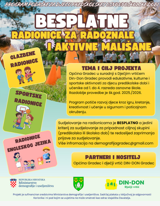 Općina Gradec pokrenula je novi program obrazovnih, kulturnih i sportskih aktivnosti namijenjen djeci predškolske dobi te učenicima od 1. do 4. razreda osnovne škole. Program pod nazivom „DIN-DON – radionice za radoznale i aktivne mališane“ provodi se u okviru nacionalnog programa poticanja edukativnih i sportskih sadržaja u lokalnim zajednicama.