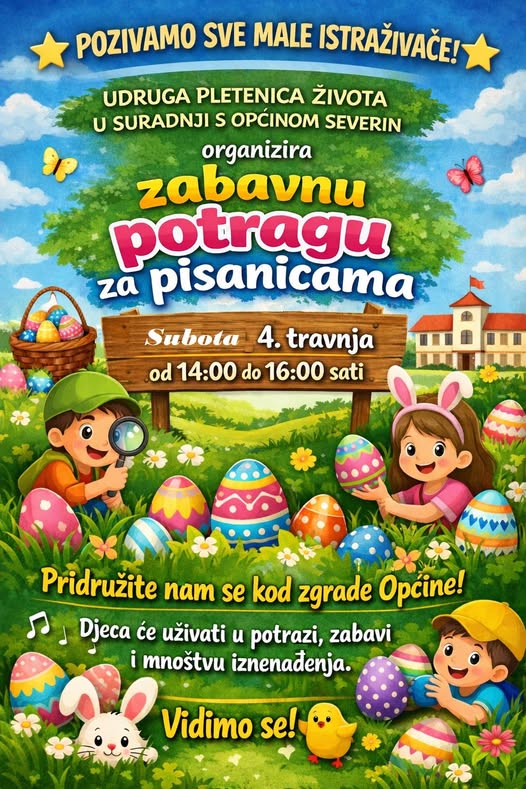 Udruga Pletenica života u suradnji s Općinom Severin organizira uskrsno događanje namijenjeno djeci, koje će se održati u subotu, 4. travnja, od 14 do 16 sati.