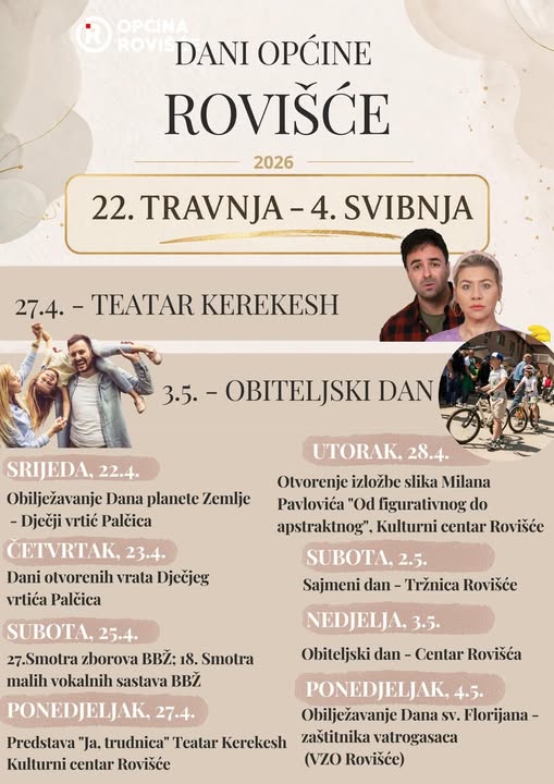 Kulturni sadržaji nastavljaju se u ponedjeljak, 27. travnja, kada će u Kulturnom centru Rovišće biti izvedena predstava „Ja, trudnica“ u izvedbi Teatra Kerekesh. Dan kasnije, u utorak, 28. travnja, u istom prostoru bit će otvorena izložba slika Milana Pavlovića pod nazivom „Od figurativnog do apstraktnog“.