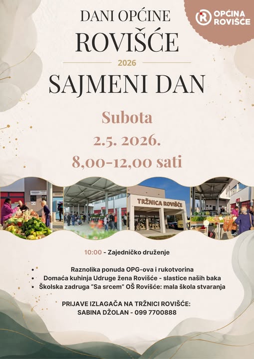 U sklopu obilježavanja Dana Općine Rovišće 2026., u subotu, 2. svibnja, na Tržnici Rovišće održat će se Sajmeni dan, događanje usmjereno na promociju domaćih proizvoda i lokalnih proizvođača.