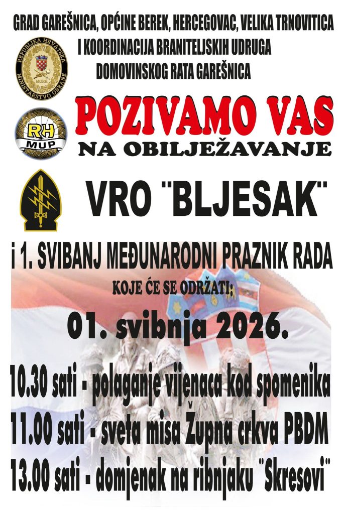 U Garešnici će se u petak, 1. svibnja, obilježiti 31. obljetnica vojno-redarstvene operacije Bljesak, uz obilježavanje blagdana svetog Josipa Radnika i Međunarodnog praznika rada. Program organizira Koordinacija braniteljskih udruga grada Garešnice te općina Berek, Hercegovac i Velika Trnovitica, a upućen je poziv svim građanima da se uključe u obilježavanje.